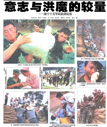 为保护人民群众生命财产安全,南宁全城动员,对邕江大堤严防死守。14天里,36万多党政军民投入抗洪抢险中,做到人在大堤在,坚决与洪水展开殊死搏斗,确保大堤安全。在这场与洪魔的殊死较量中,南国早报全程跟踪,深入、全面、立体地报道了洪灾预警、抢险安排、决战见闻、一线身影、后勤保障、避险自救和网上声音等内容;创作了抗洪歌曲,在防洪大堤上向子弟兵献唱;到抢险部队驻地派送报纸,让一线官兵及时了解抗洪新闻,在抗洪行动中充分贡献了媒体的力量。