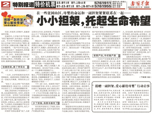 当年,广西贫困山区一些孕产妇因为山高路远,加上交不起三四百元的生产费用,选择在家生产。2006年5月起,早报发起“捐助一副担架、爱心献给母婴”行动,一批批担架被送往田东、龙胜、马山等地。