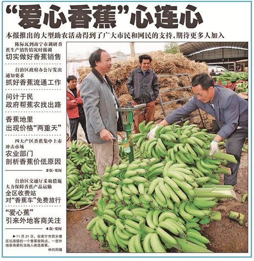 广西香蕉滞销问题引起党中央、国务院高度关注,中央电视台也给予报道。自治区相关部门出台销售补贴、拓展渠道、加强监管等扶持政策,下拨专项资金改善种植技术、提升品质、建立销售体系。广西各主要香蕉产地开通销售专线,2009年11月23日,自治区政府办公厅发通知支持香蕉销售,出台鼓励外运政策,“今天你吃香蕉没有”成了朋友间的问候语。南国早报的“爱心香蕉”活动,不仅解决蕉农眼前困难,更为农业产业发展、乡村振兴提供了有益探索和示范,荣获中国新闻奖系列报道三等奖。