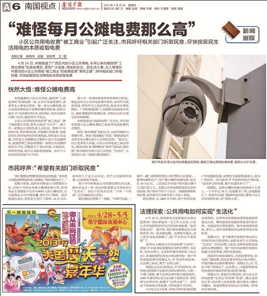 2013年4月24日,南国早报同时推出《小区公共用电不是生活用电?》《小区公共用电呼唤“生活化”》《记者申请信息公开被指“找茬”》三篇报道,首次对小区公摊电费的收费标准提出质疑。