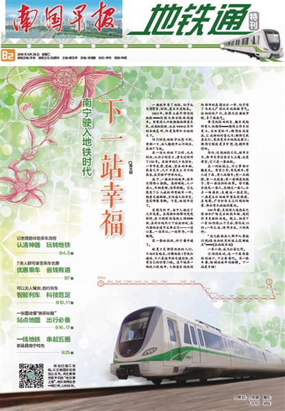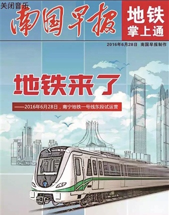 2016年6月28日中午12时,南宁市轨道交通1号线东段(南湖站一火车东站)正式开通试运营。这是广西首条建成通车的地铁线路,当日,南国早报推出32个版的“地铁通”特刊,记录广西、南宁迈入地铁时代这一历史性时刻。