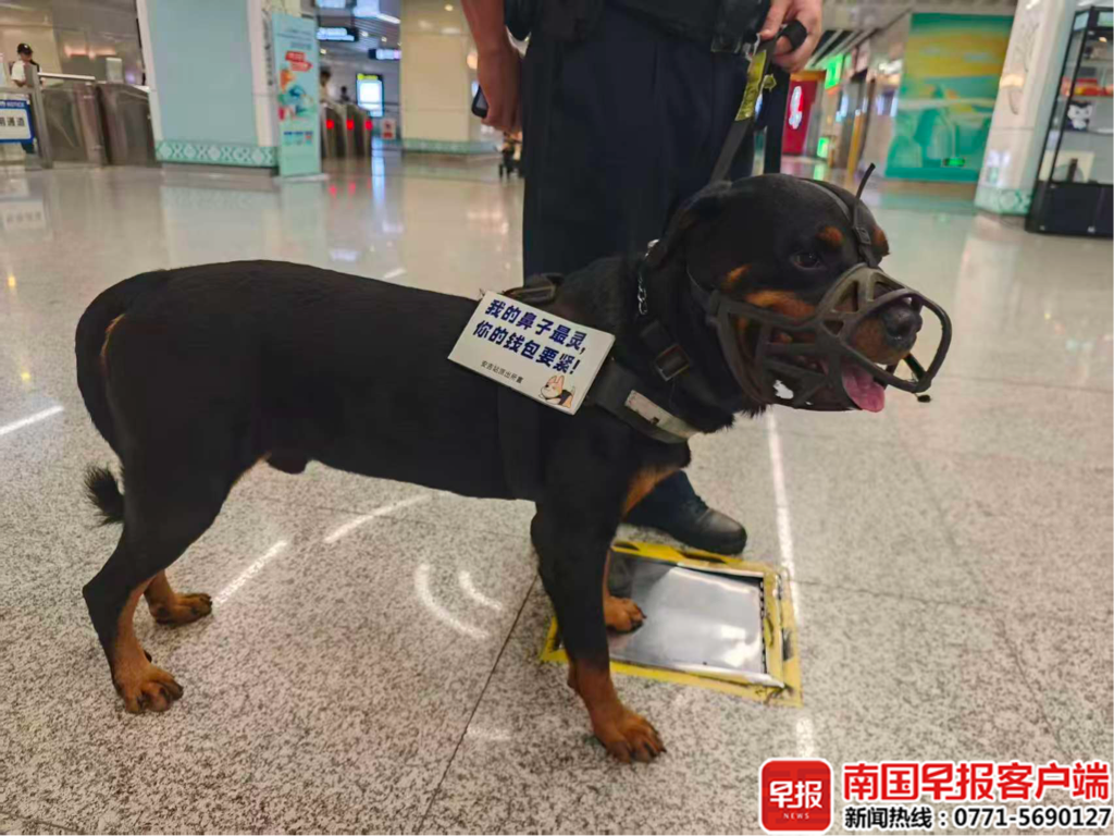 近日,南宁地铁2号线地铁警方的反诈宣传阵营出现了“明星警官”——威风凛凛的警犬。它身上挂着特制“反诈标语”,用其独特的亲和力,成为反诈宣传的一大亮点。