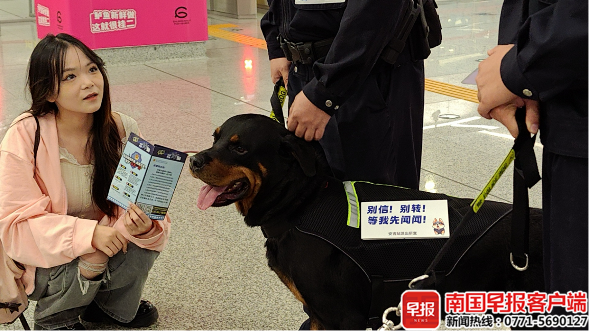 10月22日下午,南宁市公安局安吉站派出所的警犬在地铁站一亮相,就立即吸引了大家的眼球。只见两条警犬身上轮流挂着醒目的标语,如“我鼻子最灵,你钱包要紧”“别信!别转!等我先闻闻!”“诈骗陷阱,警犬为你嗅出风险”“骗子的话,我一个字都不‘汪’”,让人会心一笑。与此同时,乘客还可以通过扫描警犬宣传展板上的二维码,观看反诈短视频,同时还能听到语音播报提示。