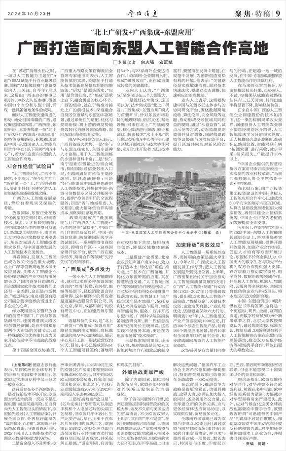 今年9月,在南宁首次举行的2025中国-东盟人工智能部长圆桌会议上,各方围绕夯实人工智能发展基础、提供开源开放服务、加强产业合作对接、促进人才培育等方面开展讨论。东盟秘书长高金洪认为,中国庞大的数字生态与领先平台将为双方合作提供强大支撑。双方应着力推动数字贸易、电子商务、数据治理等领域合作,并把握人工智能、机器人、物联网、云服务等全球趋势,共同培育独角兽企业与科技巨头,将本地区打造为创新高地。
