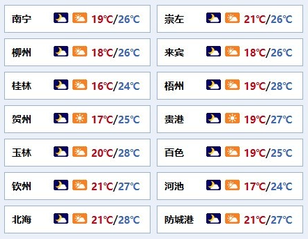 南宁市:多云,东北风2级,最低气温19℃,最高气温26℃。