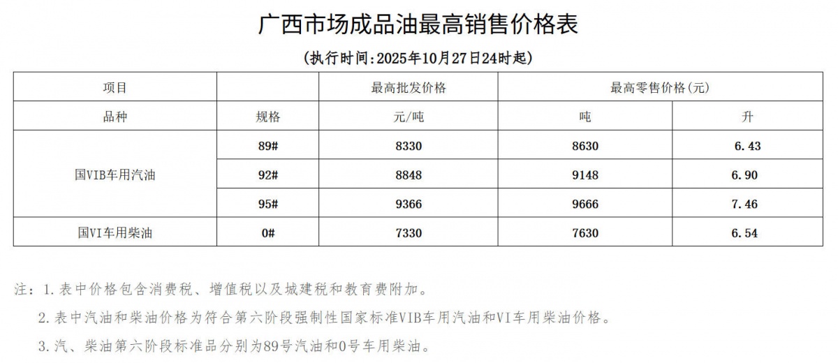 10月27日,南国早报全媒体记者从自治区发展改革委获悉,这次成品油价格调整后,广西国VIB标准89号汽油从6.62元/升调整到6.43元/升,每升下调0.19元;92号汽油从7.12元/升调整到6.90元/升,每升下调0.22元;95号汽油从7.69元/升调整到7.46元/升,每升下调0.23元;国VI标准0号车用柴油从6.76元/升调整到6.54元/升,每升下调0.22元。