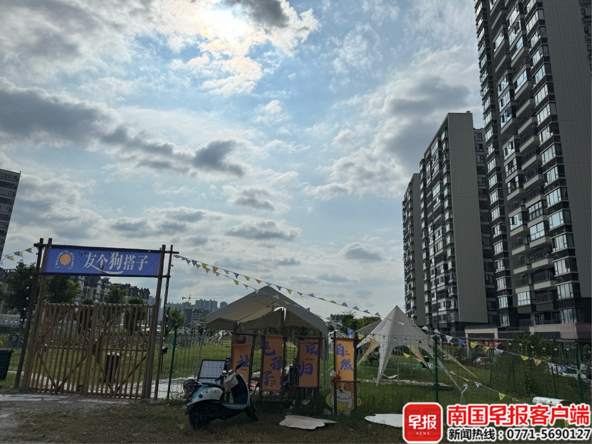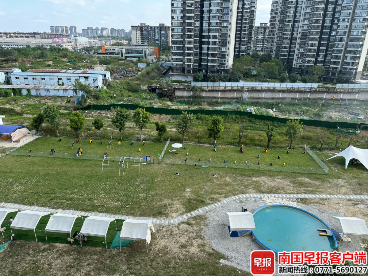 10月20日下午,记者在现场看到,该游乐场与楼栋的直线距离约10米,场内搭建了宠物狗游乐设施、游泳池,还设置多顶帐篷作为休憩区,有几名顾客带着宠物狗光顾,不时能听到犬叫声。在离游乐场几百米处,是电竞(广西)产业园的楼栋,其楼前是一个已建成的小公园,里面设有集装箱房屋,上面标有“友个狗搭子”游客中心,但大门紧闭,无人办公。
