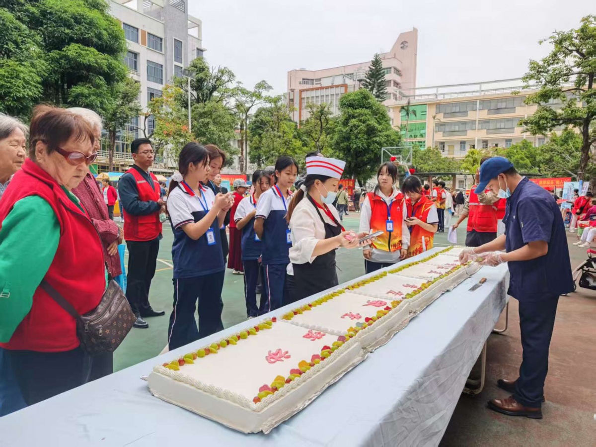 活动中,工作人员现场制作一个3米长的大蛋糕,为老人们集体“庆生”。蛋糕刚一亮相,便吸引了众多老年朋友“围观”,纷纷拍照打卡。