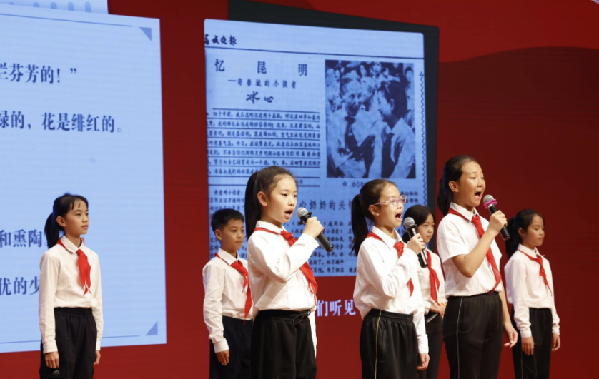 1982年,作家冰心在《春城晚报》“小桔灯”专栏题字并寄语。春城晚报11位小记者在现场诵读了《致敬文字·接力光芒》,沿着时光脉络重温名家与新闻前辈笔下见证的山河故事,向老一代新闻工作者致敬。