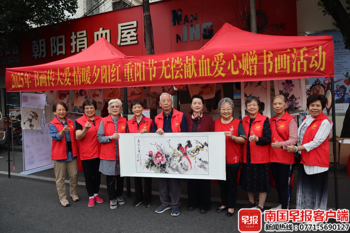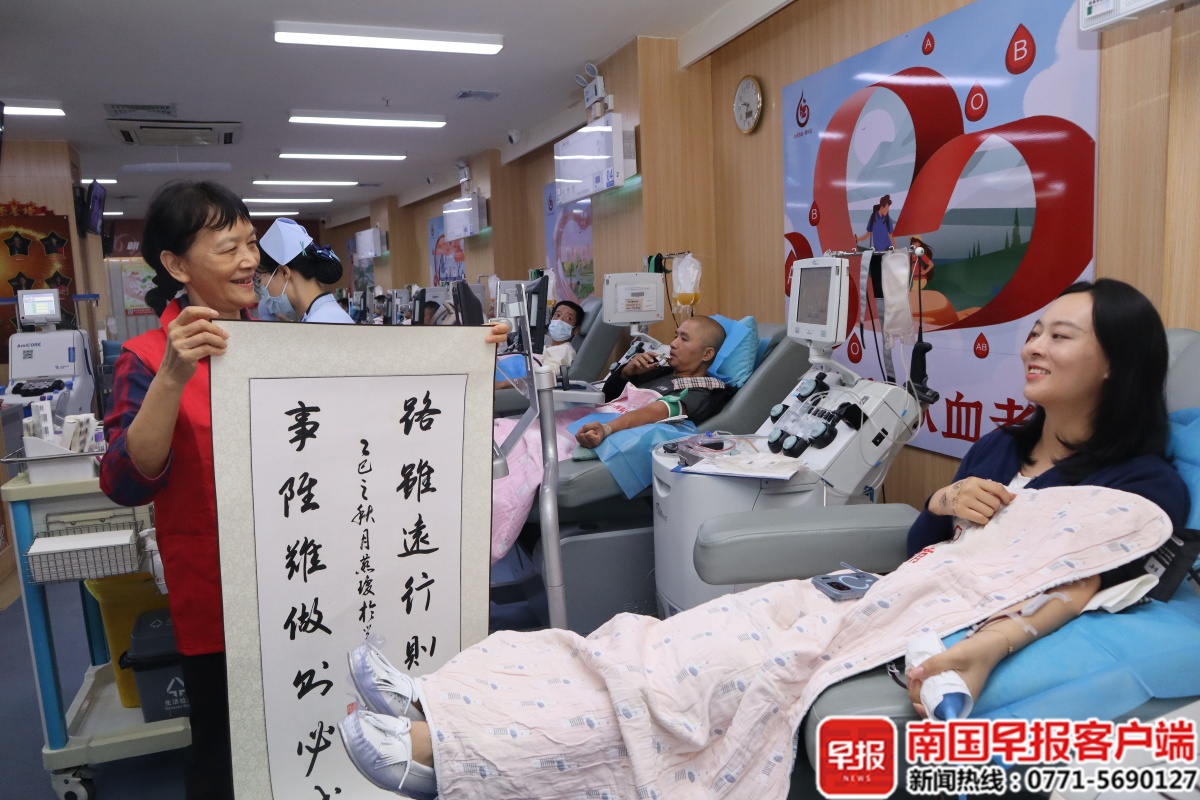 10月29日,南宁中心血站联合广西老年大学,在朝阳捐血屋开展“书画传大爱 情暖夕阳红”重阳节无偿献血爱心赠书画活动,该校的教授、学员志愿者以翰墨丹青致敬无偿献血者,大家度过了一个有意义的重阳节。