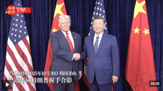 当地时间10月30日中午,中美元首会晤开始前,习近平同特朗普握手合影。