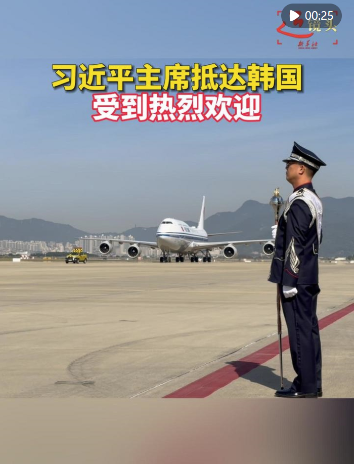 当地时间10月30日,国家主席习近平乘专机抵达韩国,将出席亚太经合组织第三十二次领导人非正式会议并对韩国进行国事访问。