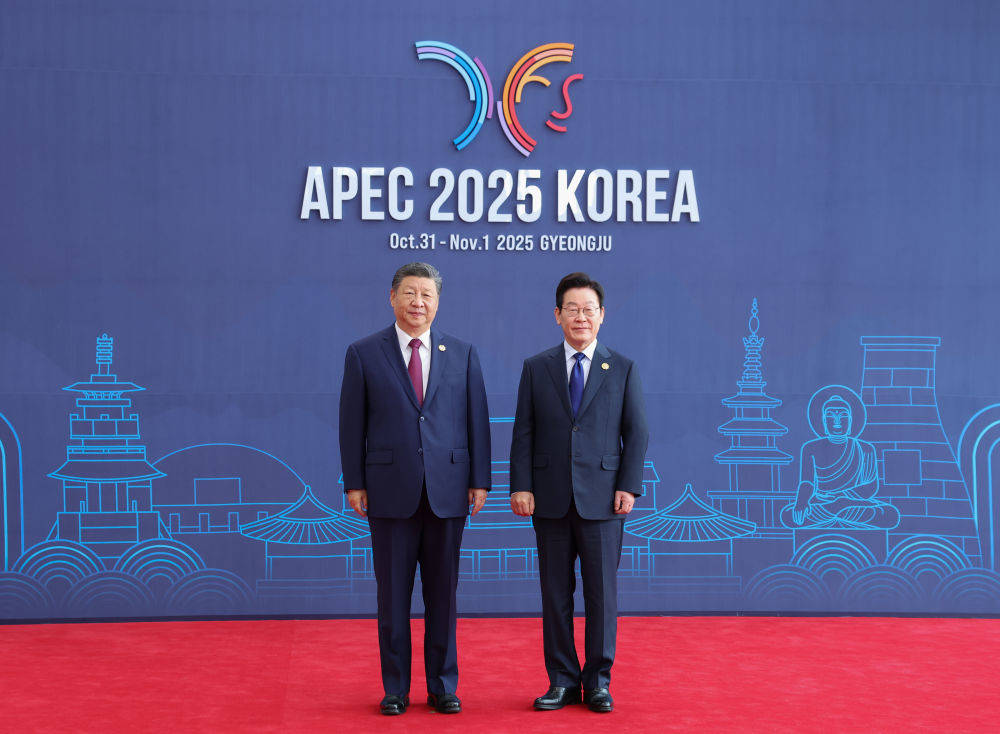 “欢迎您!”会议东道主韩国总统李在明热情迎接习近平主席。两位领导人亲切握手合影,共同步入会场,边走边谈。