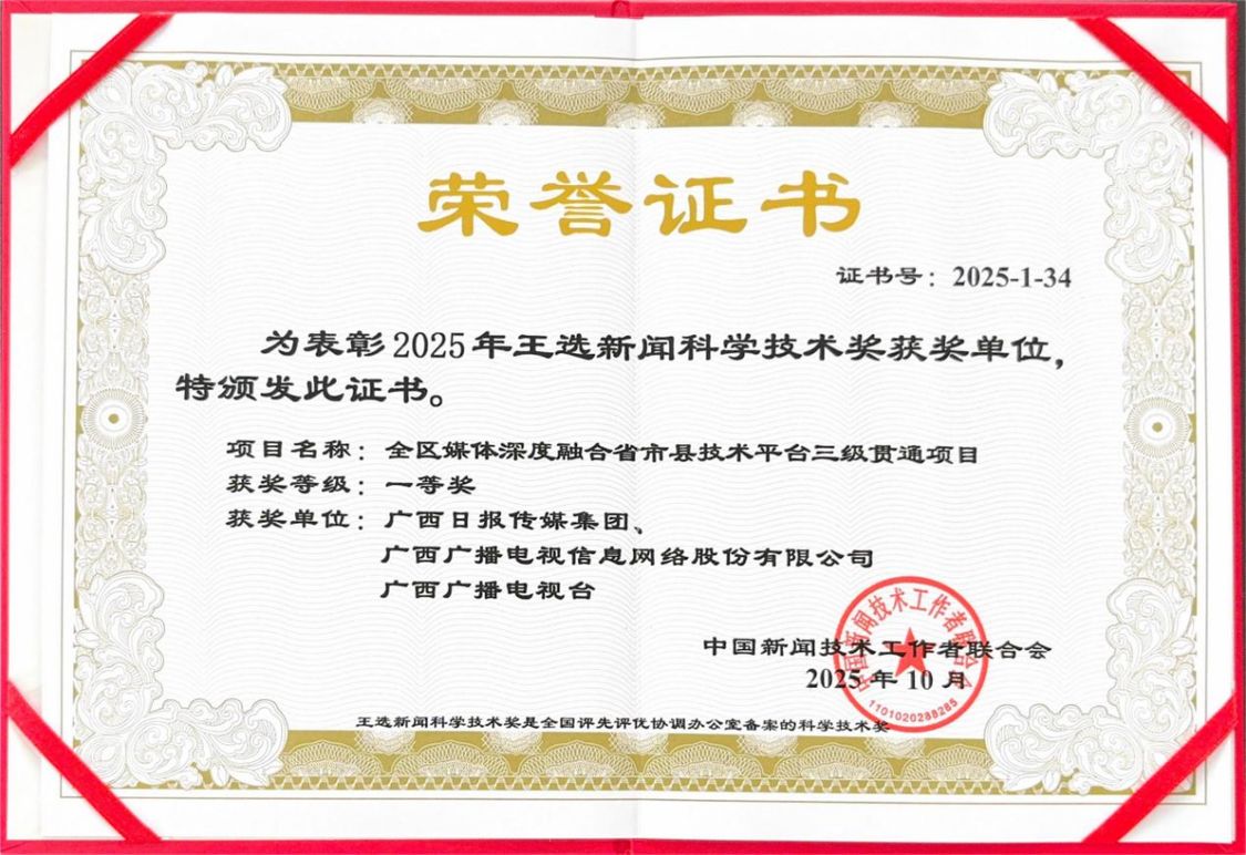2025年10月31日,“王选新闻科学技术奖”颁奖大会在四川成都圆满举办。在自治区党委宣传部的统筹领导下,广西日报社、广西广播电视信息网络股份有限公司、广西广播电视台共同倾力建设的“全区媒体深度融合省市县技术平台三级贯通”项目凭借突出的技术创新与应用价值,成功斩获2025年“王选新闻科学技术奖”(项目奖)一等奖。
