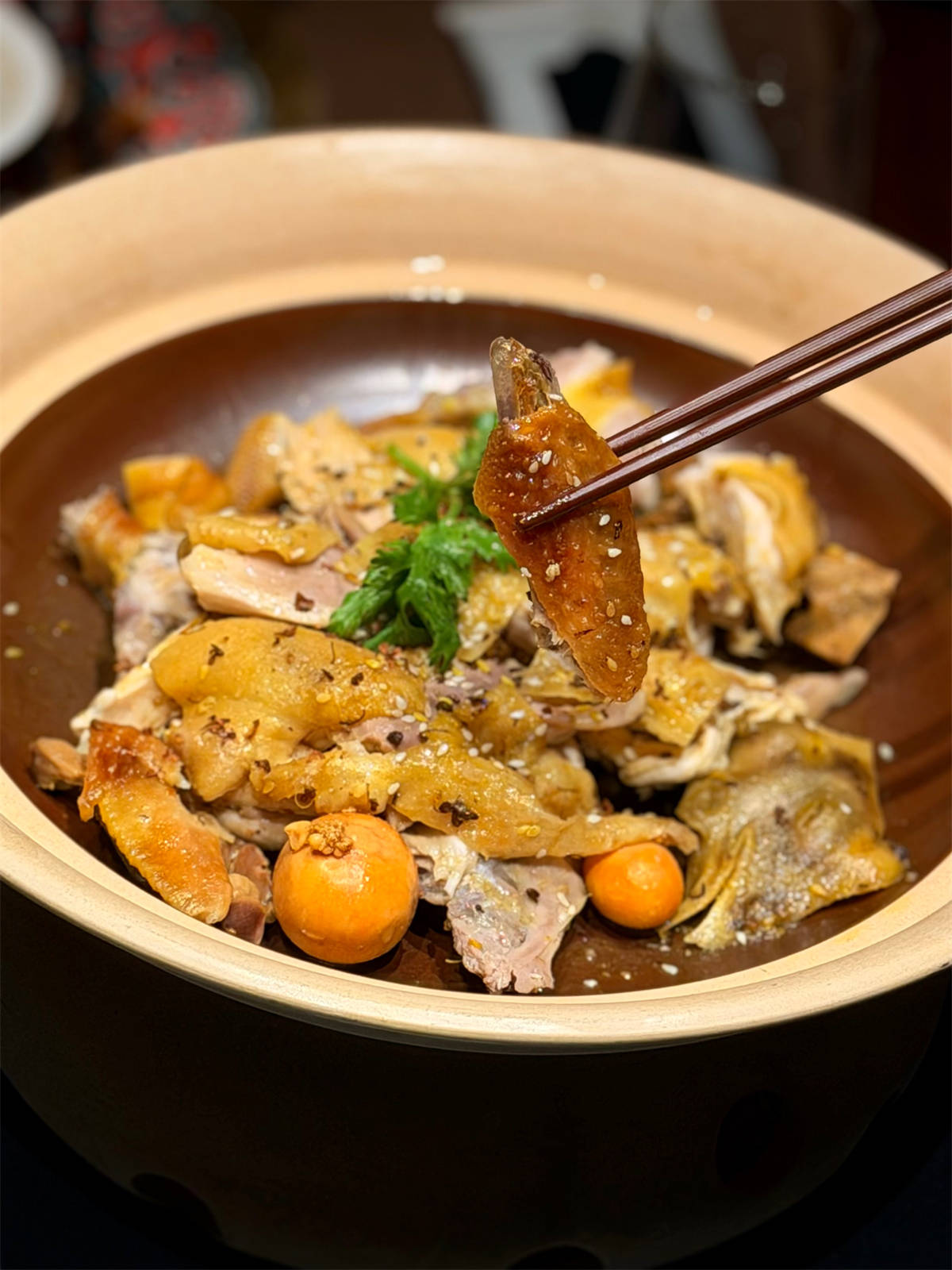 餐厅主打招牌菜“古法盐焗鸡”坚守传统工艺,采用传统柴烧铁锅,以厚厚一层秘制粗盐慢焗而成。上桌时温度恰到好处,鸡皮微带焦香,肉质鲜嫩弹滑,咸香入味,深入肌理,让人回味无穷。