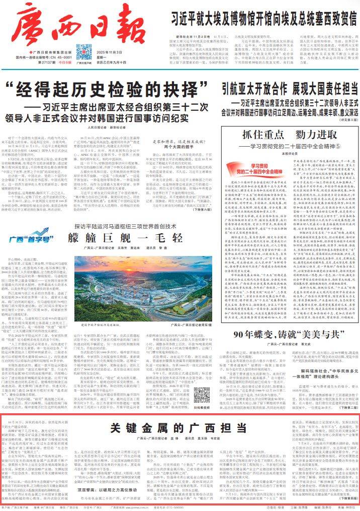 ——创新添动能。紧盯自治区政策动向,推动企业与科研院所联合攻关。凝练的12个关键金属技术攻关项目,已通过广西重点研发计划专家组评审公示,“卡脖子”难题有望逐个得到破解。