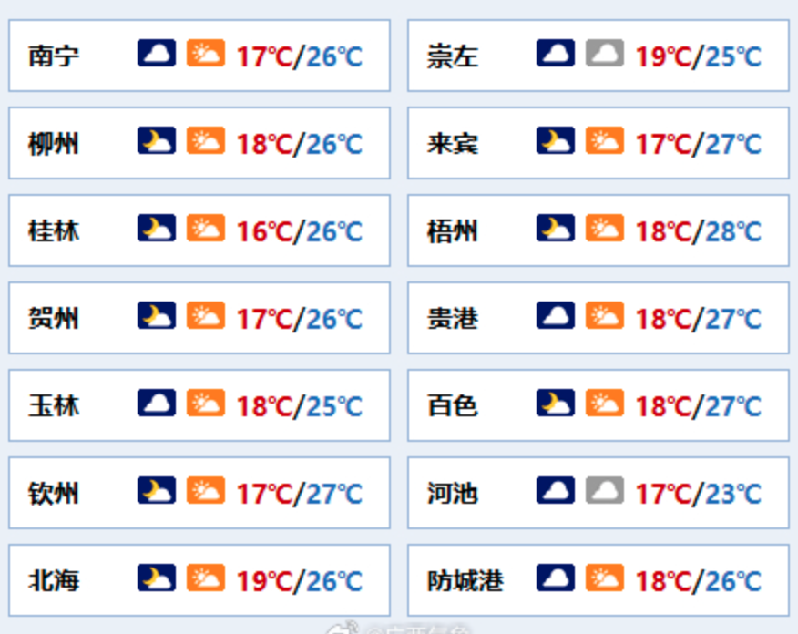 南宁市:阴天到多云,偏东风1~2级,最低气温17℃,最高气温26℃。