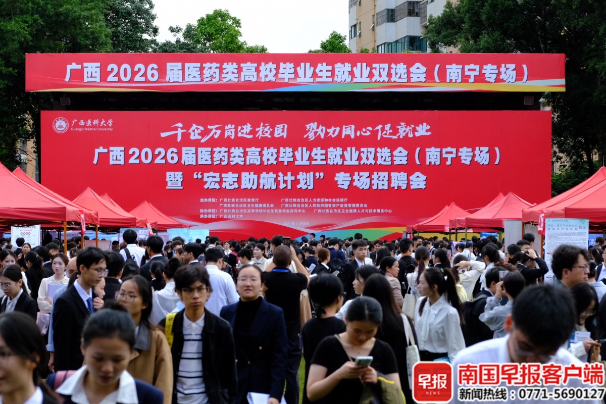 11月9日,广西医科大学本部人头攒动,由自治区教育厅、人社厅、卫健委、国资委联合主办的广西2026届医药类高校毕业生就业双选会(南宁专场)在此举行。全国16个省(区、市)的480家用人单位参会,涵盖医药生产研发、医疗服务、健康管理等多个领域,为1.8万名参会毕业生提供约1.6万个就业岗位。双选会上,在部分医院招聘岗位缩减、学历门槛提高、区域生源偏好等多重因素下,不少毕业生面临“选择难”。