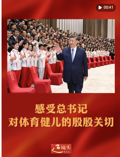 习近平总书记高度重视和关心体育事业,党的十八大以来多次寄语中国体育健儿。每次见到大家,总书记都会点赞运动员们的优异成绩和拼搏精神,勉励大家奋力拼搏、再创佳绩,为建设体育强国作出新贡献。