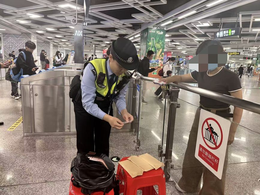 11月7日晚,一名女乘客出现在地铁1号线火车东站F安检口,手提塑料袋、身背双肩包,一边打电话一边将物品放在安检机上。过安检后离开时,她仅拿走塑料袋,不慎遗忘了背包。此时,屯里站派出所辅警陈秋香从安检员处得知情况后,立即拿起背包向周围乘客询问失主,却无人应答。为尽快找到失主,陈秋香打开执法记录仪后,打开背包查看,希望从中找到失主的有效身份信息。