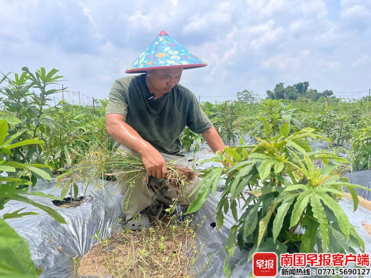 7月18日中午,在钦州青草村的五指毛桃种植基地,村民施国就正顶着太阳,打理种植了一年多时间的五指毛桃。尽管早已汗流浃背,但他却忙得不亦乐乎,因为这些埋在地底下的根茎能变成“金疙瘩”。这些年,通过种植五指毛桃,施国就年增收三四万元。