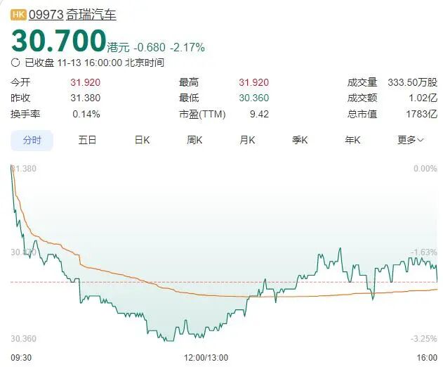 13日下午,记者注意到,在港交所上市的奇瑞汽车(09973)当日股价出现下跌。昨日收盘价为31.38港元,今日开盘价为31.92港元,中午一度跌到30.36港元。下午4时收盘时,奇瑞汽车的价格为30.70港元,每股下跌0.68港元,降幅2.17%,目前总市值为1783亿港元。