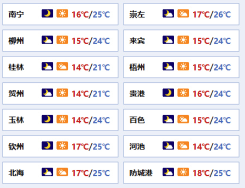 南宁市:晴,偏北风2~3级,最低气温16℃,最高气温25℃。