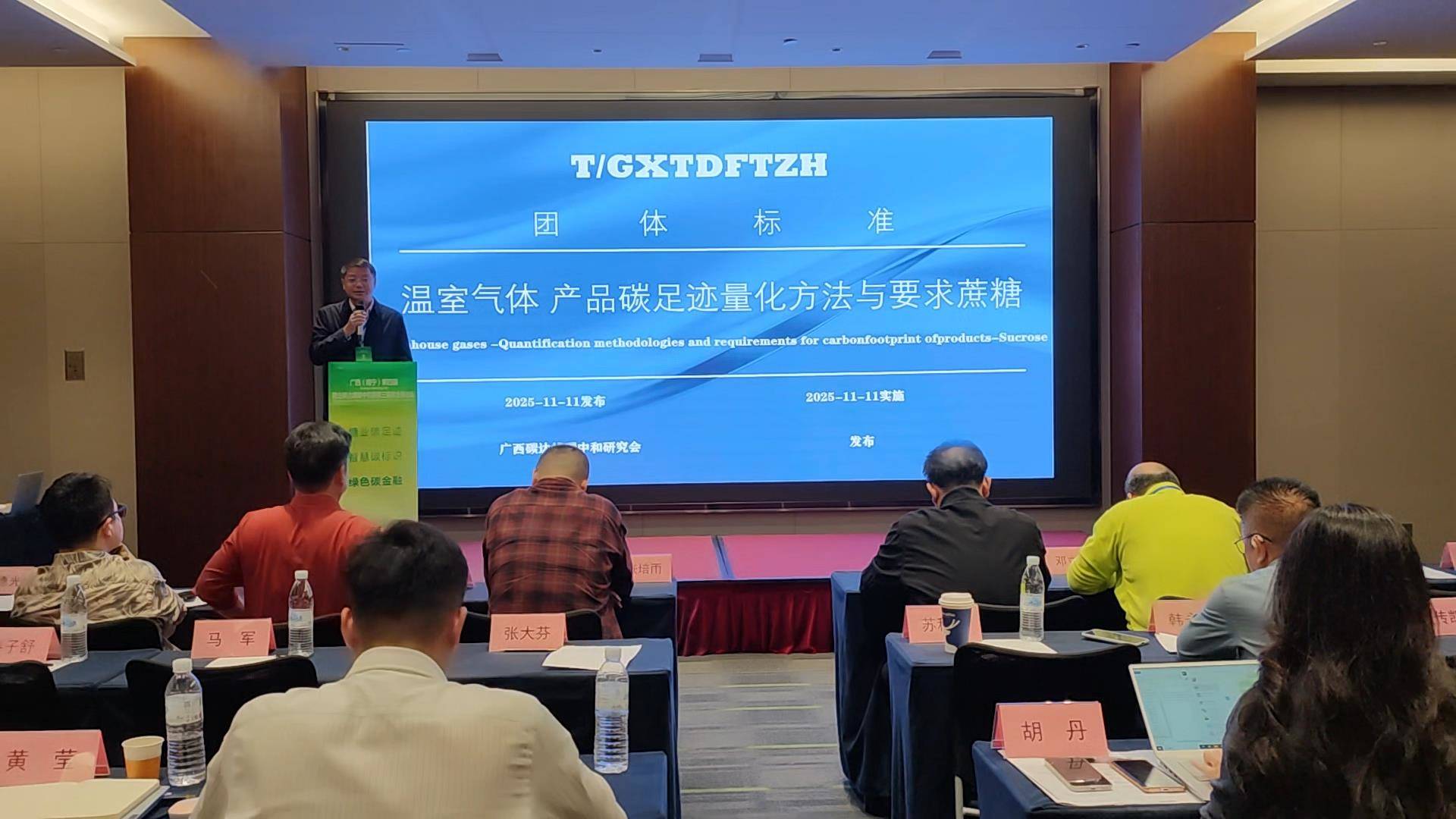 论坛的核心成果之一,便是《温室气体、产品碳足迹量化方法与要求(蔗糖)》团体标准的正式发布。据广西节能减排研究会副会长刘栩介绍,该标准历时十个月编制完成,80余名科技人员参与其中,凤糖集团、洋浦南华糖业集团等龙头企业全程参与论证,经专家评审认定具有原创性、前瞻性和实用性。尤为重要的是,该标准填补了我国蔗糖碳足迹量化领域的空白,为糖业全生命周期碳排放核算提供了依据,同时为国际间碳排放量交流与互认提供了有力支撑。▲《温室气体、产品碳足迹量化方法与要求(蔗糖)》团体标准正式发布。