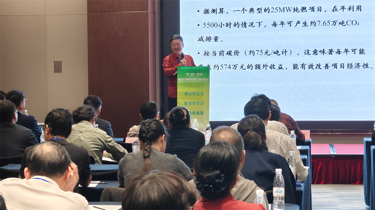 论坛期间,多位专家学者围绕产业低碳发展热点问题展开深度研讨。桂林航天工业学院章景皓教授解析了广西能源消费与碳排放责任的形成机理,北投集团低碳公司李帅总监展望了“十五五”绿色经济发展趋势,广西大学海涛教授聚焦农林生物质发电的挑战与机遇,广西经贸职业技术学院蓝天讲师则提出了碳金融助力糖业转型的实践路径。上海市浩信(南宁)律师事务所高级合伙人韦德光还从司法视角拆解了碳金融实践中的法律风险,为产业健康发展保驾护航。▲广西大学海涛教授聚焦农林生物质发电的挑战与机遇。