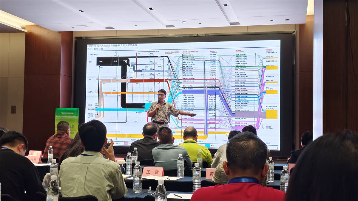 “碳足迹就像产品的‘绿色身份证’,记录了蔗糖从种植、生产、运输到销售全生命周期的碳排放总和。”广西碳达峰碳中和研究会执行会长兼秘书长李凌通俗地解释道。他表示,有了团体标准,能通过蔗糖碳足迹逐步推动碳标识实施。目前,在国际市场上,碳排放量已成为影响商品价格的重要因素,低碳产品因其生态环保属性更受消费者青睐,这将倒逼糖企加快绿色转型步伐,从源头减少农药、化肥使用,推动产业向生态化、高品质方向发展。▲桂林航天工业学院章景皓教授解析广西能源消费与碳排放责任的形成机理。