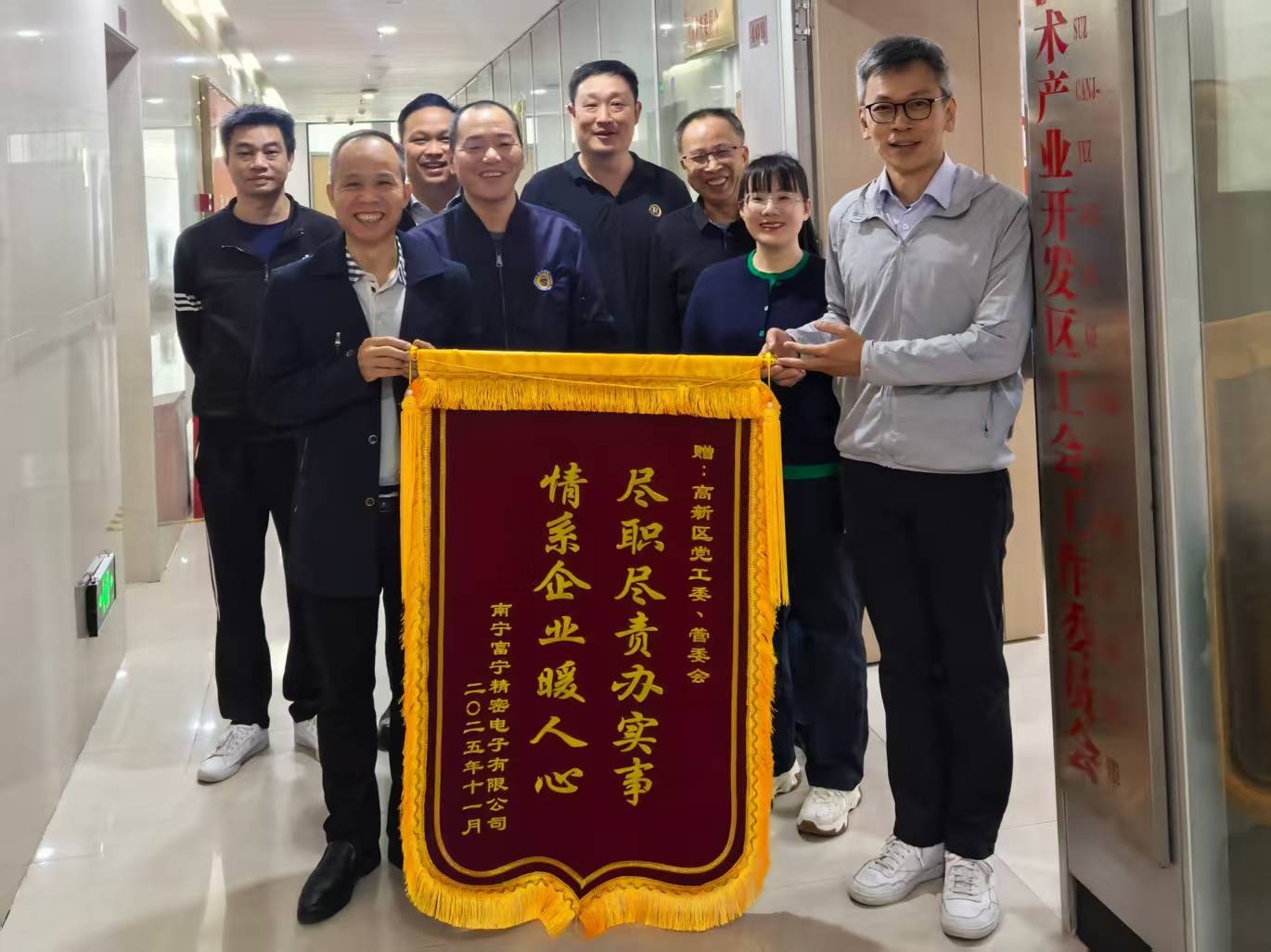 一面锦旗,一份认可;一声感谢,一份担当。11月14日上午,南宁富宁精密电子有限公司的企业代表专程前往南宁高新区办公大楼火炬大厦,将一面绣有“尽职尽责办实事 情系企业暖人心”的鲜红锦旗郑重递交,以此向始终给予企业暖心关怀与高效支持的南宁高新区党工委、管委会领导和广大干部职工表达最诚挚的谢意。