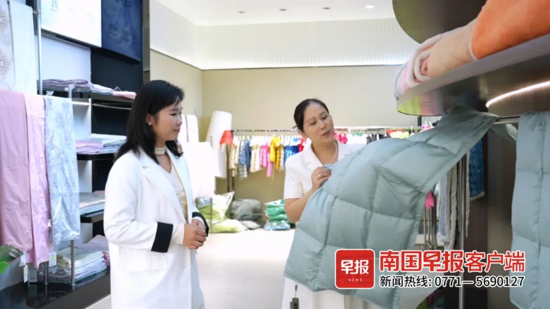 品牌情怀藏于设计之中,霖达羽绒团队以贵港市花荷花为灵感,打造“家和万事兴”系列羽绒产品并延伸至全套床品,还在羽绒被一角设置“小口袋”,让客户看得到、摸得到填充羽绒的真材实料。“未来,我们还计划融入少数民族元素,让产品承载更多‘广西符号’!”何丹丹说。