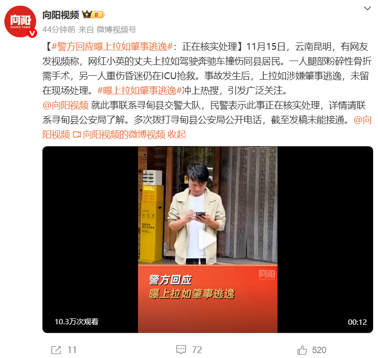 据向阳视频报道,11月15日,云南昆明有网友发视频称,网红小英的丈夫上拉如驾驶奔驰车撞伤同县居民。一人腿部粉碎性骨折需手术,另一人重伤昏迷仍在ICU抢救。事故发生后,上拉如涉嫌肇事逃逸,未留在现场处理。随后,话题“曝上拉如肇事逃逸”冲上热搜,引发广泛关注。
