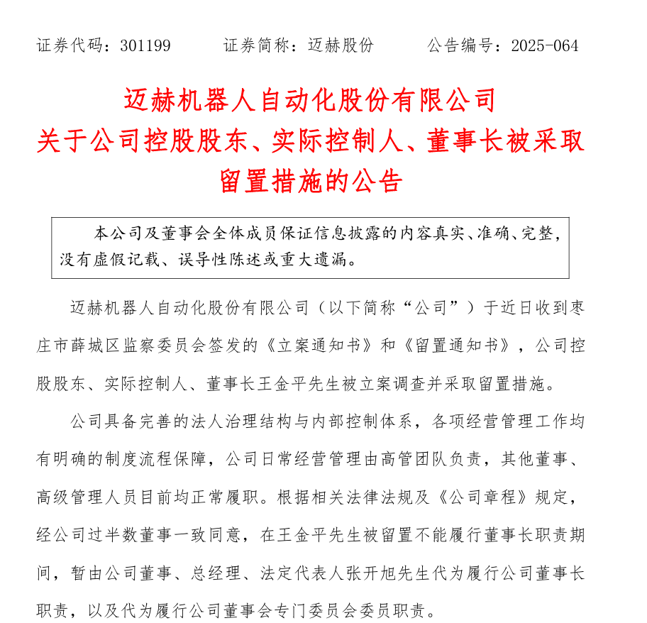 迈赫股份11月16日发布公告称,公司于近日收到枣庄市薛城区监察委员会签发的《立案通知书》和《留置通知书》,公司控股股东、实际控制人、董事长王金平被立案调查并采取留置措施。