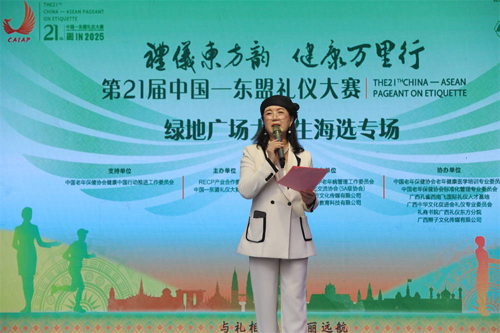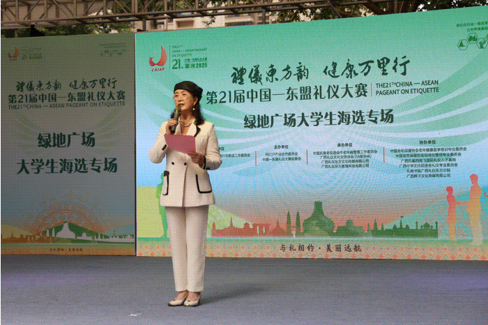 11月16日下午,第21届中国-东盟礼仪大赛大学生海选专场在南宁绿地中央广场举行。来自广西各高校的青年学子齐聚一堂,以礼仪为基、以才艺为笔,在舞台上展现当代大学生的青春风采与文化素养。▲中国-东盟礼仪大赛组委会执行主席潘玲致辞。