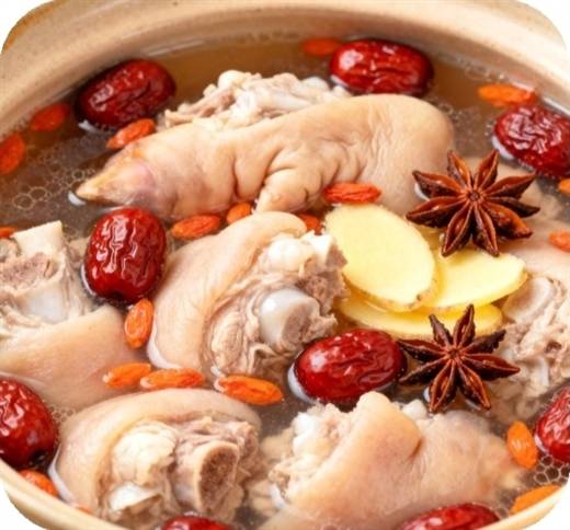 做法:将猪脚清洗干净,砍块后用开水焯烫去腥。将猪脚、八角、生姜、红枣放入锅中,加适量清水,大火煮沸后转小火炖煮1.5~2小时。加入枸杞和盐调味,再煮10分钟即可。建议每周食用1至2次,适合冬季或胃寒腹痛或呕吐清水等症状明显时服用。