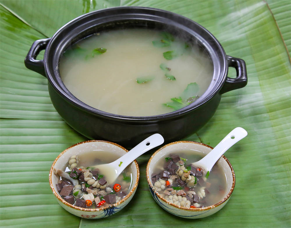 黑猪腊肉与腊肠则凝聚时光的醇厚。本地黑猪肉以古法熏制,松柏轻烟中慢慢成就晶莹腊肉与醇香腊肠——是待客的珍馐,也是游子的乡愁。▲隆林羊瘪汤