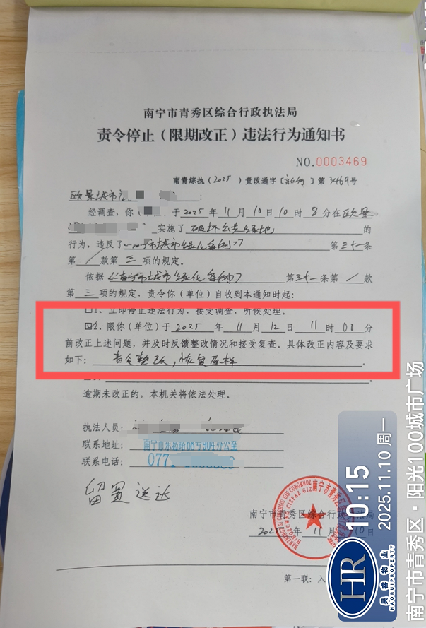 南宁市青秀区综合行政执法局作出的责令停止(限期改正)违法行为通知书显示,涉事业主破坏公共绿地,违反了相关条例,责令整改,并限于11月12日11时前恢复原样。
