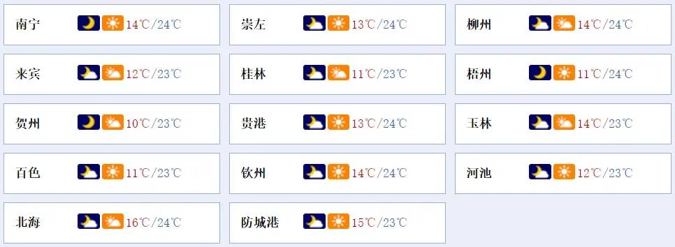 南宁市:晴间多云,东北风1~2级,最低气温14℃,最高气温24℃。