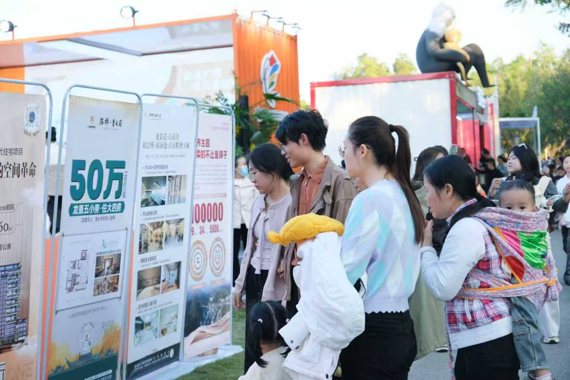 ▲来往游客驻足查看房源推荐、改善户型等住房信息。 潘荣赛 姚琳尹摄