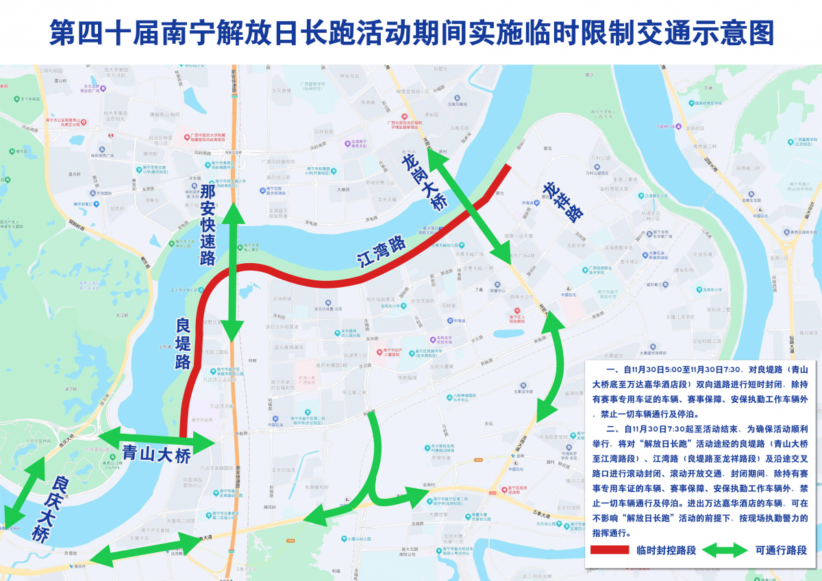 11月30日,第四十届南宁解放日长跑活动将在南宁举行。比赛当天,南宁公安交管部门对市区部分道路、桥梁实施临时限制交通措施,请市民注意绕行。据悉,此次赛事将为参与者提供免费公交摆渡车服务。(点击查看详情)