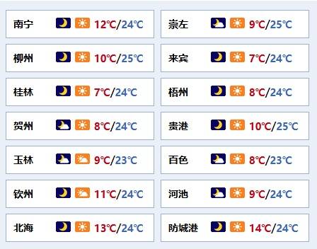 南宁市:晴间多云,东北风1~2级,最低气温12℃,最高气温24℃。