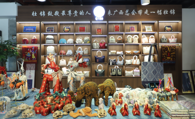 除了壮锦系类产品,广西工艺美术研究院还将壮锦与壮刀、油茶文化结合,通过 “非遗 + 创新” 模式进一步推动民族文化的传承与发展。广西工艺美术研究院总经理方圆表示:“我们希望通过工美臻选这个平台将中华的优秀传统文化种到年轻人的心中,为文化自信、文化自强注入鲜活动力。”