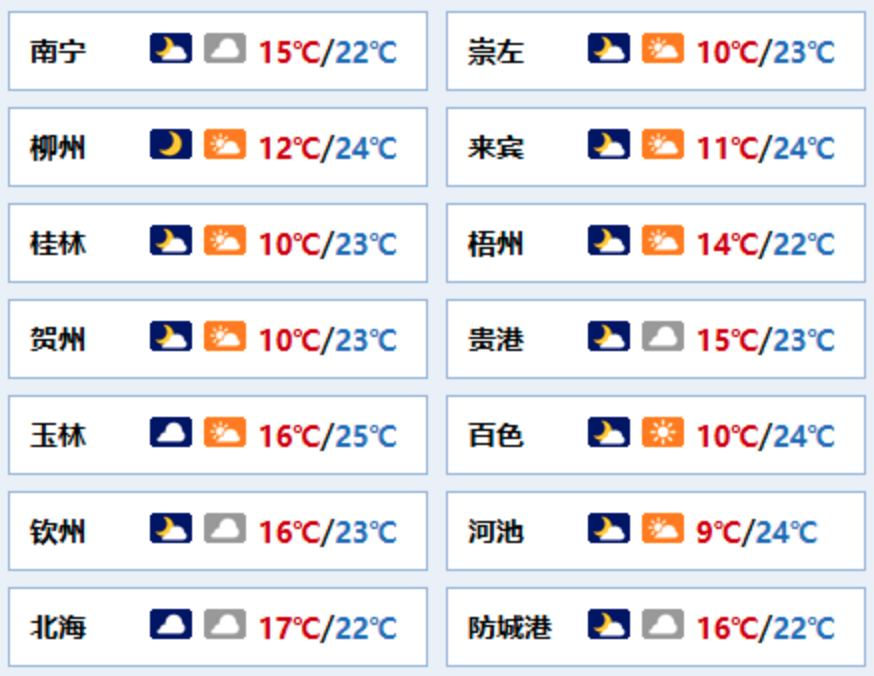 南宁市:多云转阴天,偏东风1~2级,最低气温15℃,最高气温22℃。