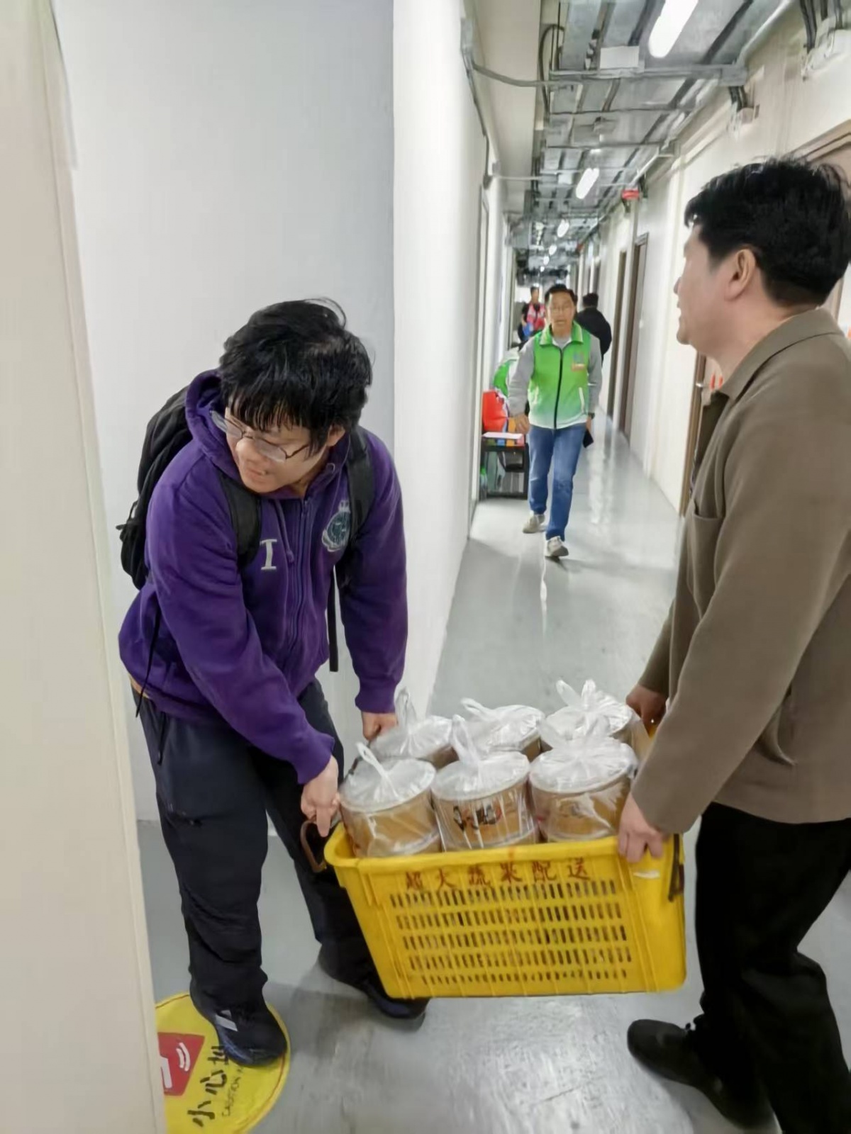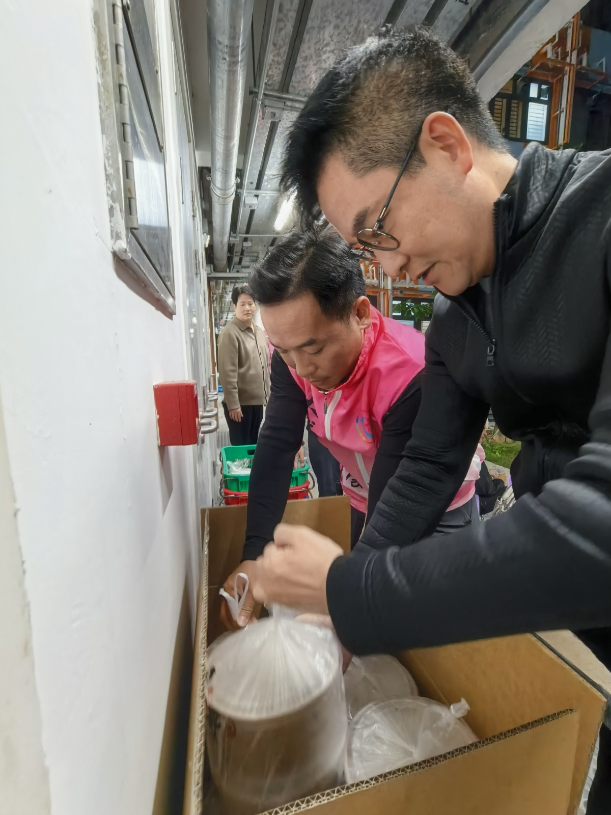 自治区政协委员、香港广西社团总会副会长陈博智和秘书长罗志超在香港协助派餐给受灾居民。自治区政协办公厅供图