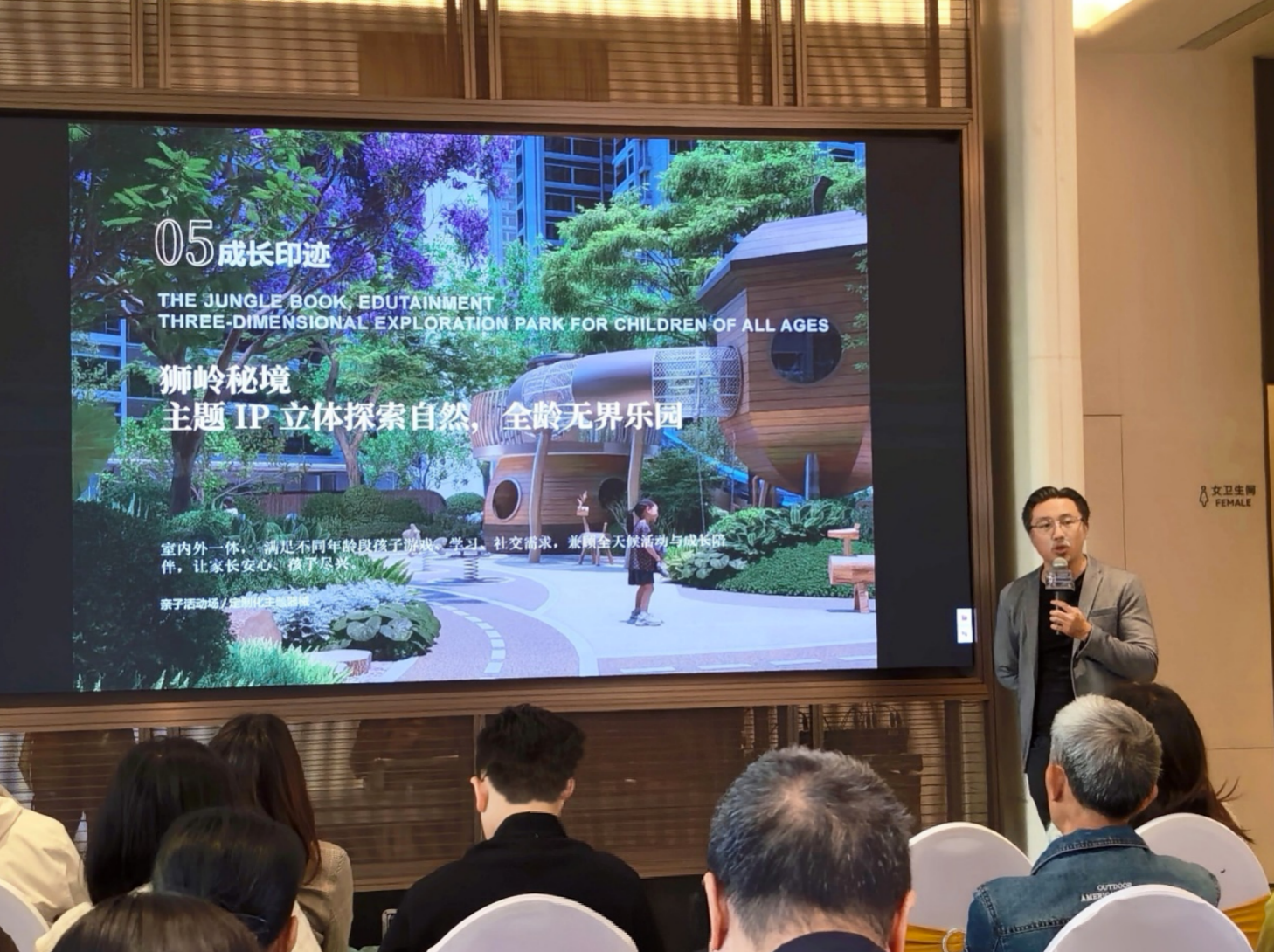 景观设计如何与老城烟火共生共荣?笛东规划设计副总裁李景辉分享了“生态与体验”的营造哲学。面对如何在城市中延续自然生机的课题,设计团队提出了“两轴一环、两庭八园”的森系格局;通过约108米的洄梦长廊、度假泳池等场景,将自然的静谧与度假的惬意融入日常,让回家成为一场穿越森林的旅行。