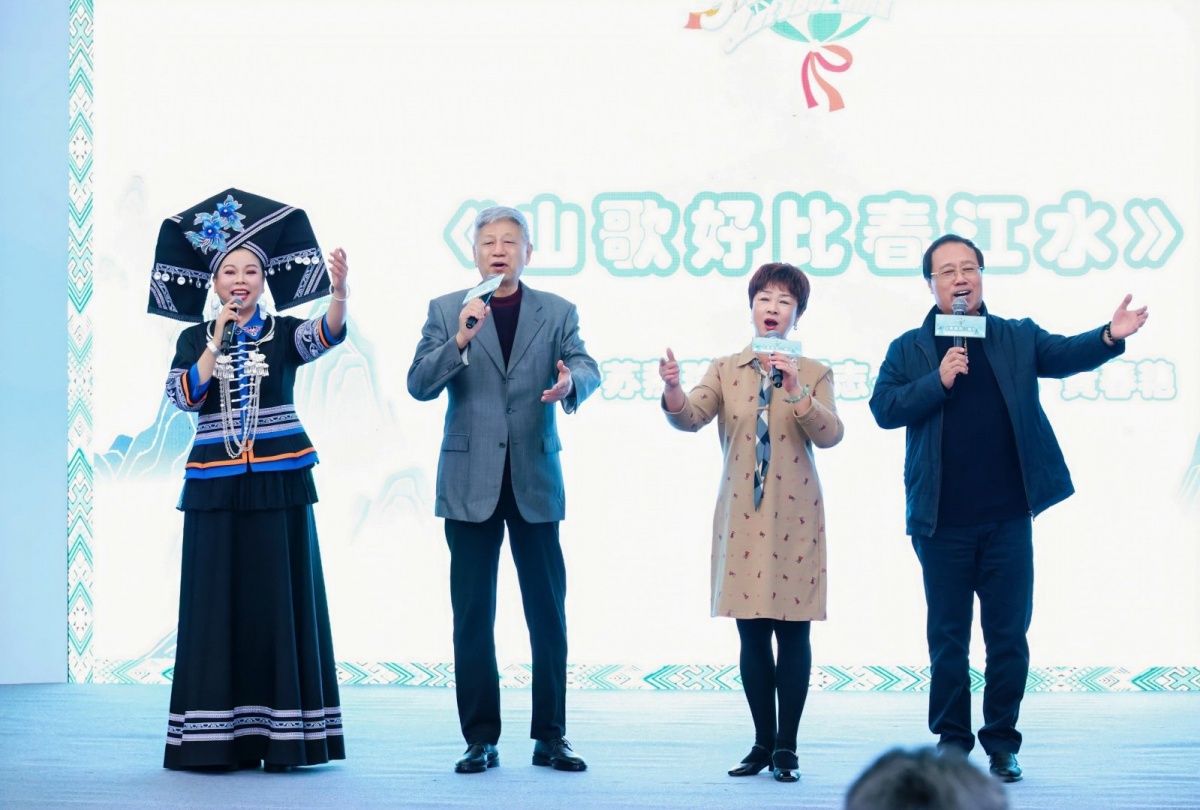 “我今没有好茶饭,只有山歌敬亲人。”第三代“刘三姐”唐佩珠、鲍朝志、贾双飞、黄春艳等广西资深艺术家同台演唱《山歌好比春江水》,一亮嗓就吸引了全场目光。“90后”广西山歌王蒋成现编山歌献唱,也引来满堂喝彩。