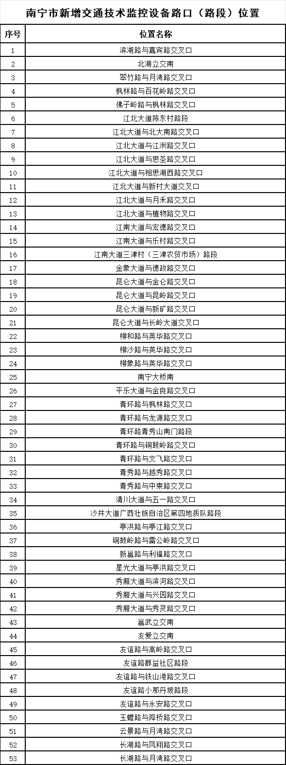 南国早报全媒体记者注意到,此次启用电子警察设备的53个路口及路段,涵盖江北大道、昆仑大道及青环路等沿线多个交叉口,南宁大桥南、邕武立交南、友爱立交南、北湖立交南等多座立交桥,以及江北大道陈东村路段、友谊路群益社区路段、沙井大道广西壮族自治区第四地质队路段等路段。