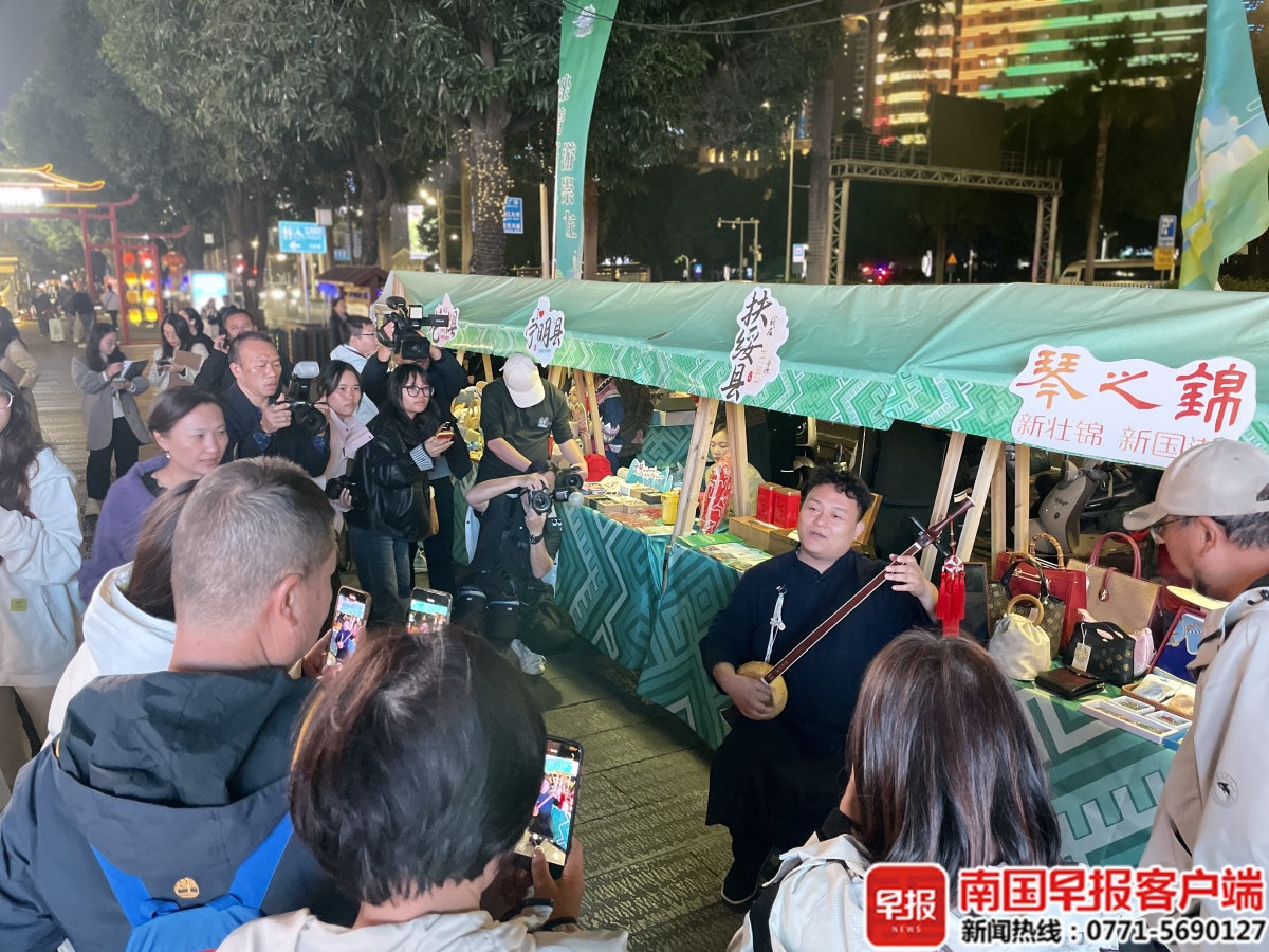 据悉,南凭高铁崇凭段共设崇左南站、宁明东站、龙州站、凭祥东站,其中崇左南站为既有车站,其他为新建车站。当晚,崇左市文旅推介官向观众重点推荐了4条串连各站点的精品路线,涵盖红色旅游、山水寻觅与特色体验等多元主题,系统介绍了各线路的亮点与安排,为游客提供了出行参考。活动集市区,凭祥市、龙州县、宁明县、扶绥县集中展示各地名特优产品与非遗文创产品,现场响起的壮族天琴琴声悠扬,为现场增添了浓郁的民族风情。