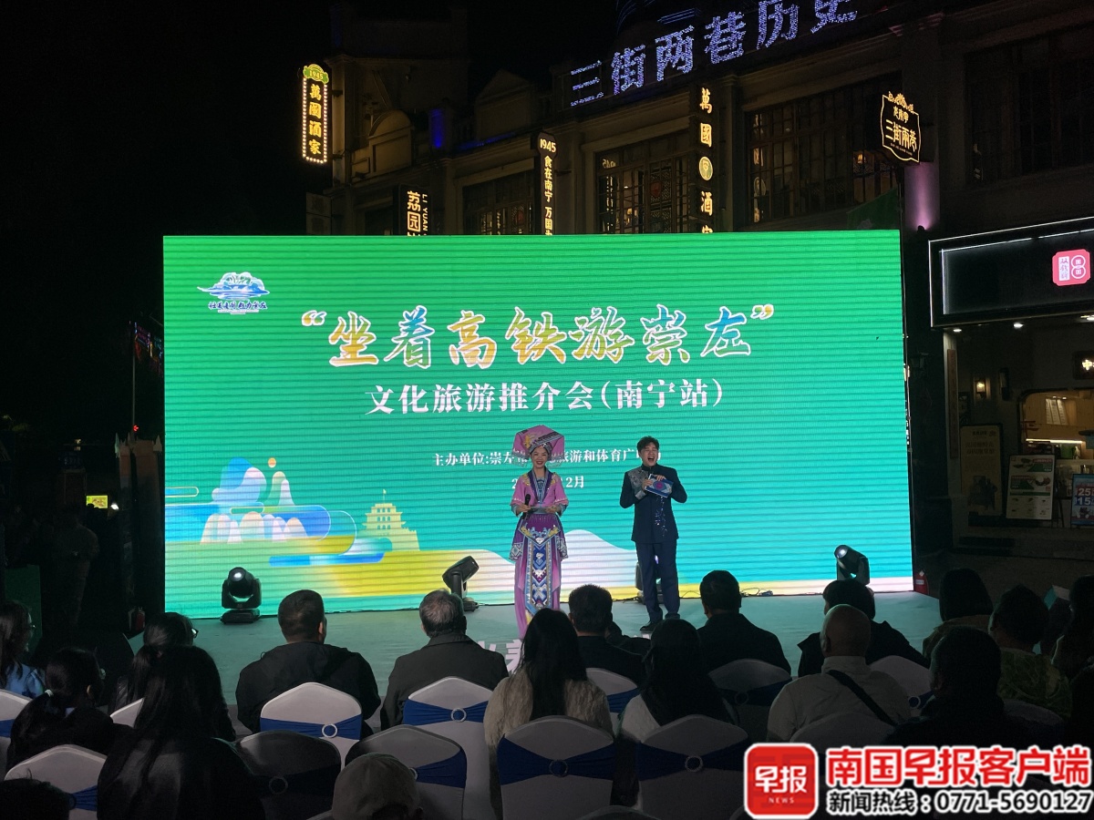 为抢抓南凭高铁全线贯通机遇,进一步打响“壮美边关 魅力崇左”文化旅游品牌,12月3日,崇左市在南宁三街两巷历史文化街区举办“坐着高铁游崇左”文旅推介活动,重点推介了崇左特色文旅资源和精品旅游线路,并发布相关旅游优惠政策。
